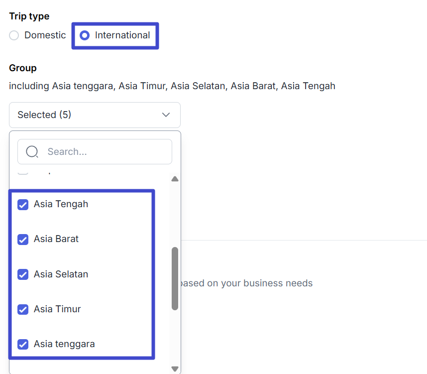 Apabila Anda memilih tipe perjalanan bisnis Domestik, maka selanjutnya Anda dapat menentukan grup/zona sesuai dengan Trip type yang telah ditentukan. Klik “Select zone” untuk memilih zona atau pilih View destination list untuk melihat daftar destinasi yang sebelumnya sudah dibuat pada tab Groups.