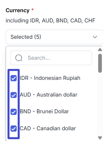 Selain itu, tentukan Currency. Pada tahap ini, Anda dapat menambahkan hingga lima mata uang dari negara yang berbeda.