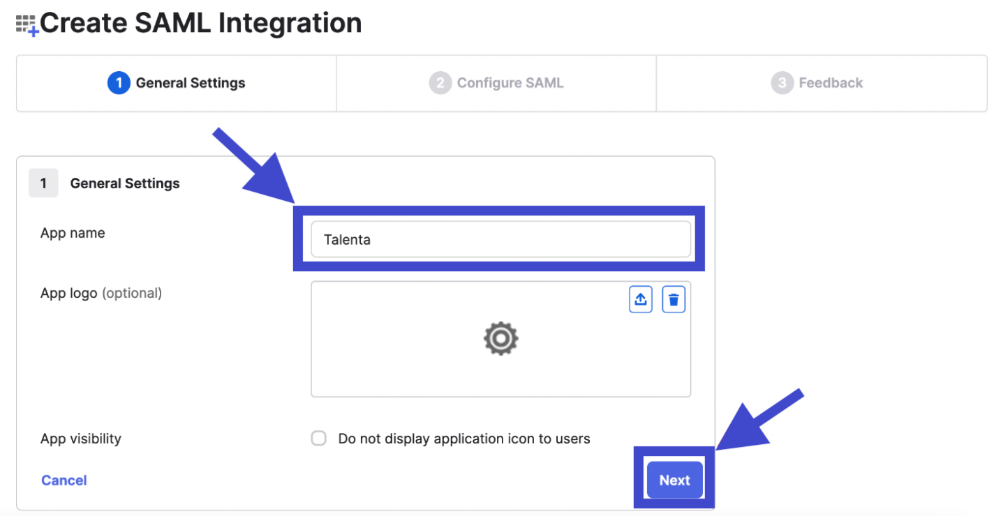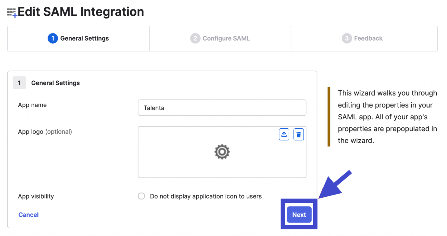 - Kemudian, Anda akan diarahkan ke halaman Edit SAML Integration, dan pada tab General Settings, klik "Next".