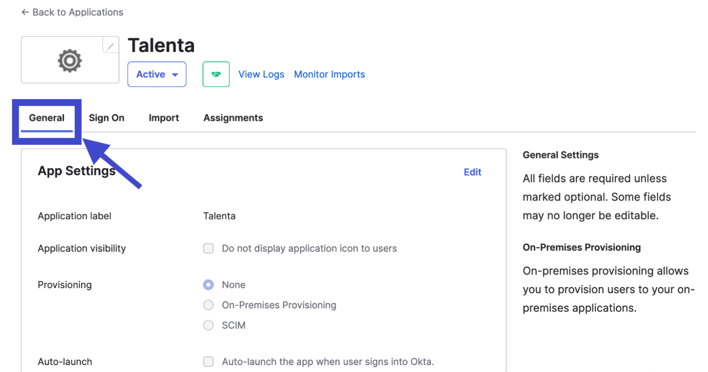 - Pada email yang Anda terima, Anda akan mendapatkan detail mengenai konfigurasi dasar SAML yang berisi Entity ID dan ACS URL. Untuk mengatur konfigurasi ini, Anda dapat masuk ke halaman aplikasi, lalu pilih tab General.