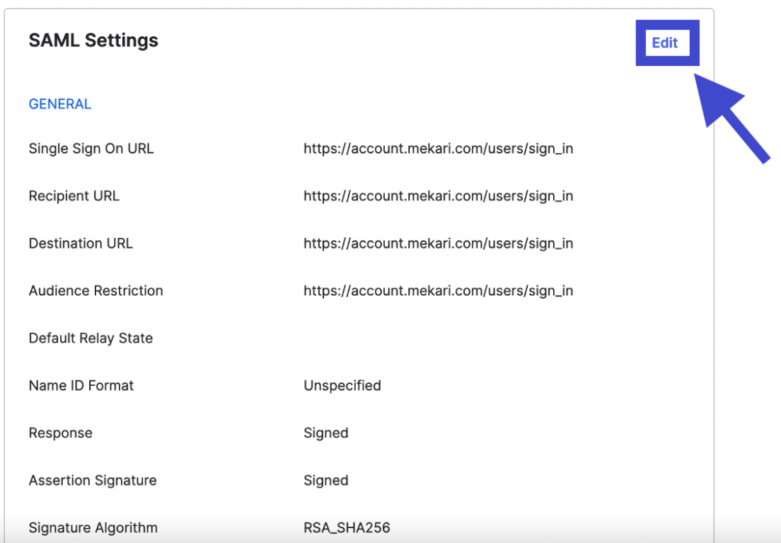 - Scroll ke bawah halaman, dan pada bagian SAML Setting, klik "Edit".