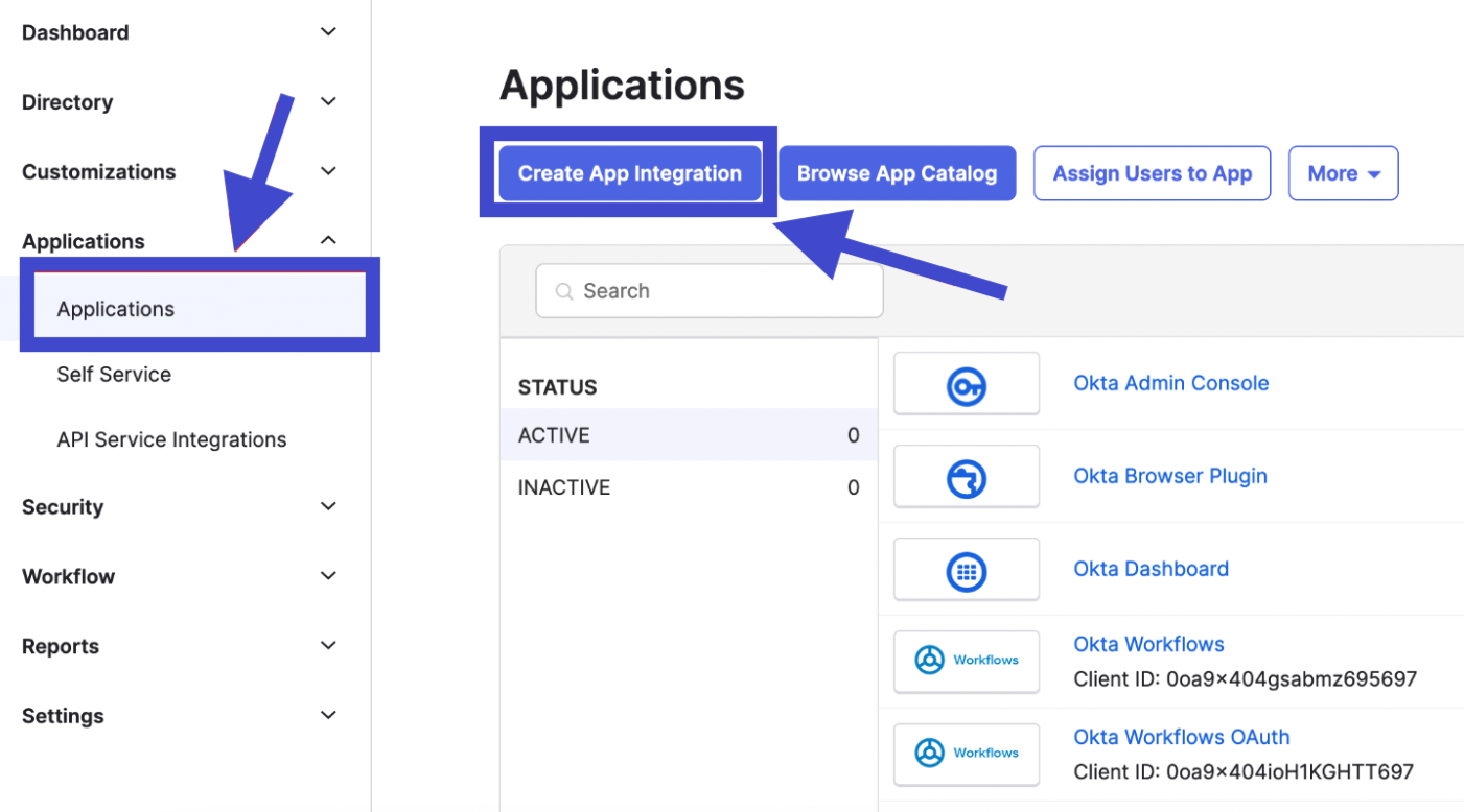 - Kunjungi dashboard admin Okta. Pada tab bagian kiri, klik "Applications" dan Anda akan diarahkan ke halaman Aplikasi, kemudian klik “Create App Integration”.