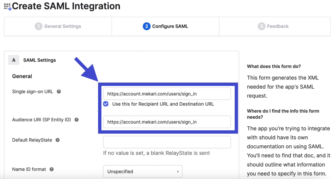 - Lalu Anda akan diarahkan ke tab Configure SAML, dimana Anda dapat mengisikan Single sign-on URL dan Audience URL (SP Entity ID) dengan https://account.mekari.com/users/sign_in sebagai placeholder sementara.
