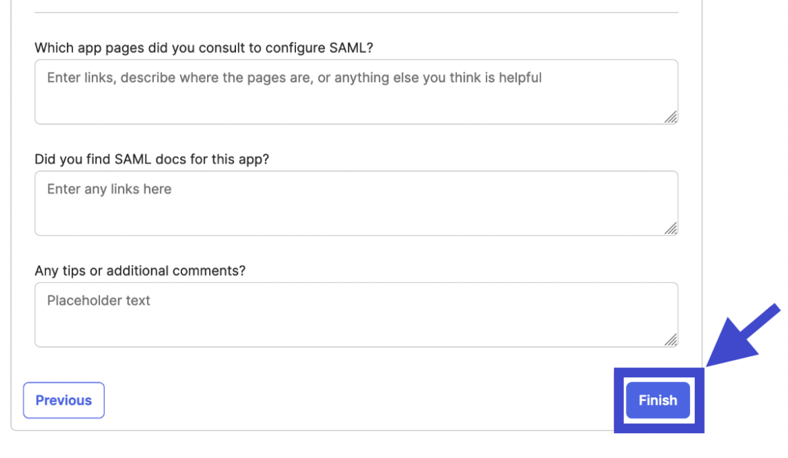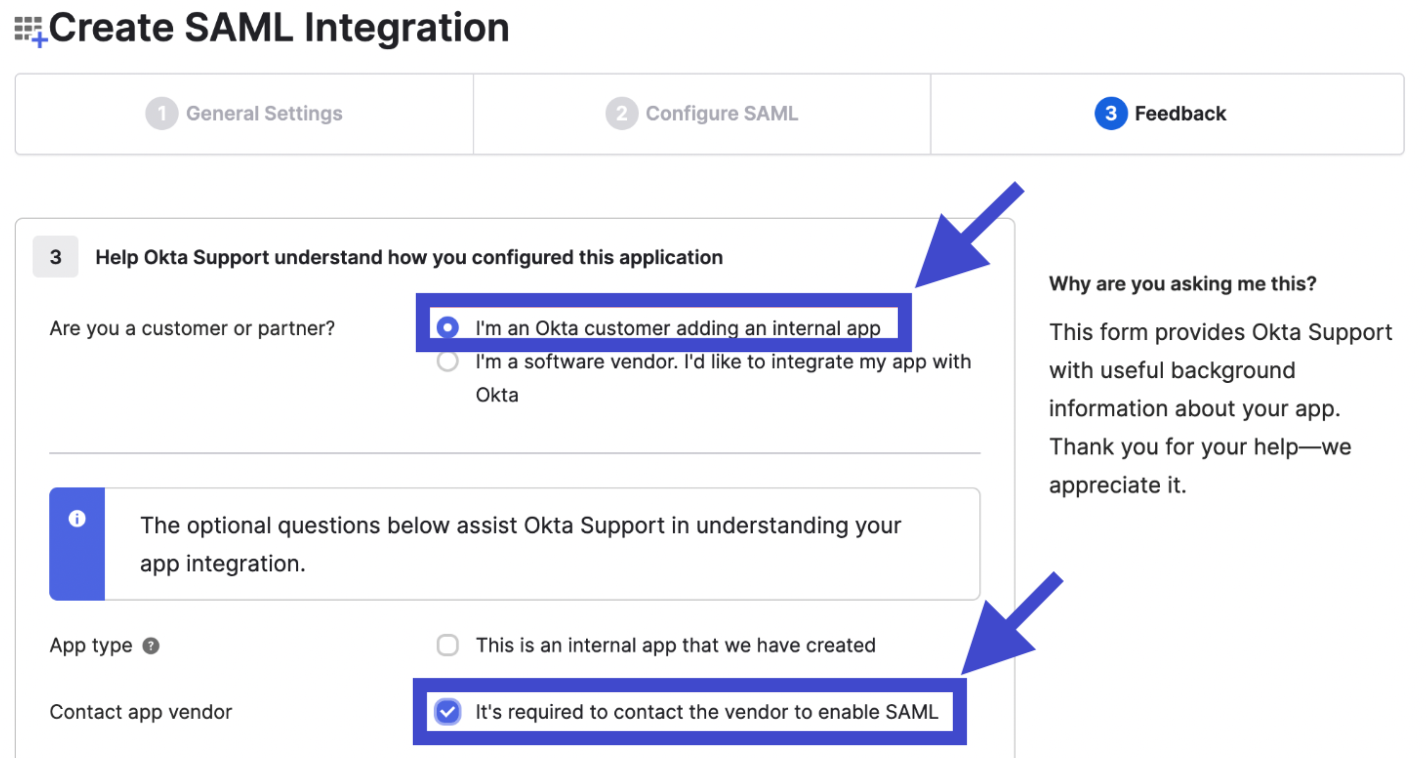 - Lalu setelah itu, Anda akan diarahkan ke tab Feedback. Pada kolom Are you a customer or partner?, Anda dapat memilih opsi “I’m an Okta customer adding an internal app” pada kolom dan Anda dapat centang opsi “It’s required to contact the vendor to enable SAML” pada kolom Contact app vendor.