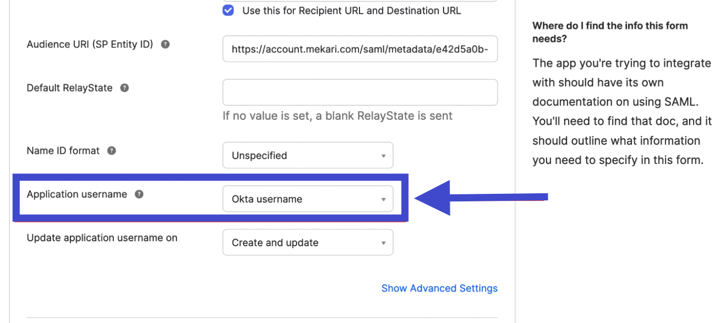 - Kemudian, pada kolom Application username, pastikan bahwa opsi yang Anda pilih mengarah pada data atribut pengguna yang memiliki nilai yang sama dengan kolom alamat email yang Anda masukkan ketika melakukan Invitation dari produk Mekari.