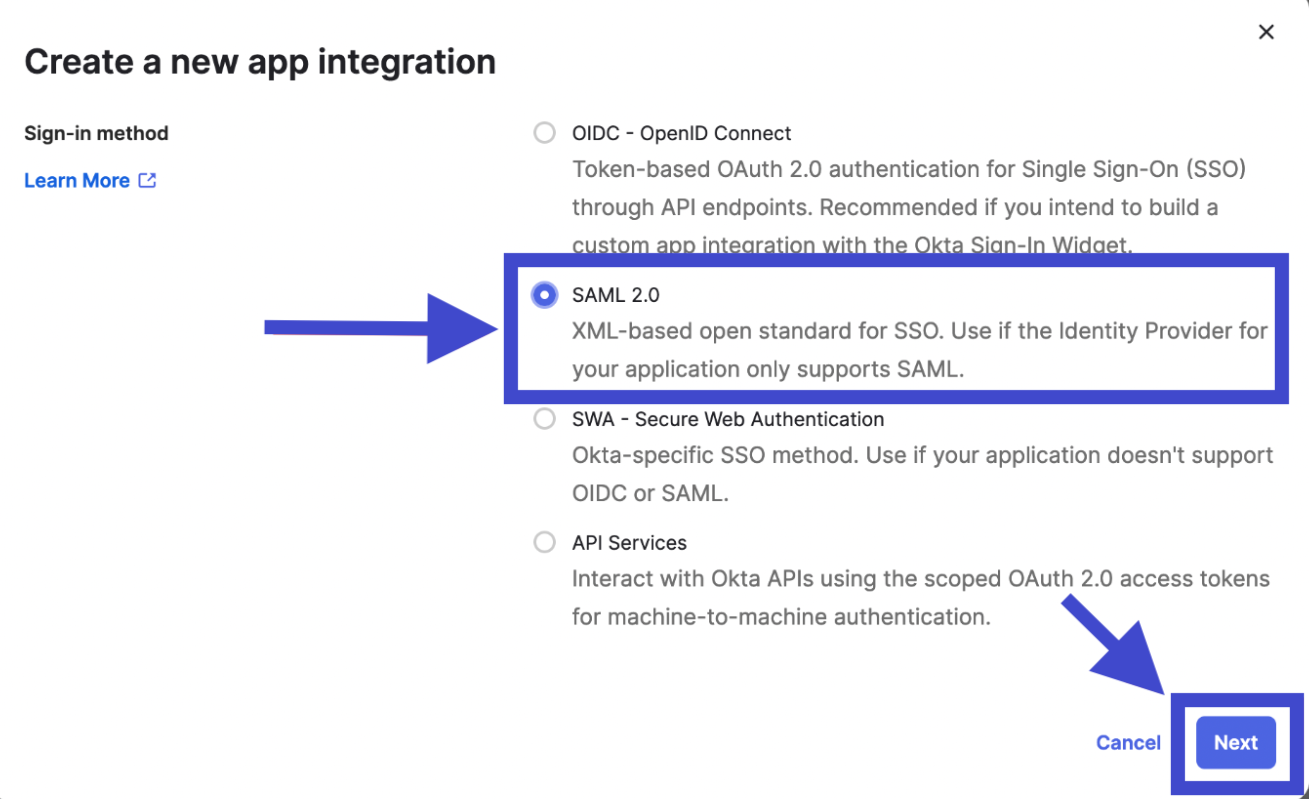 Untuk mengaktifkan integrasi SAML, Anda perlu membuat App integration baru melalui pusat admin Okta. Berikut adalah langkah-langkah untuk App integration baru pada Okta: