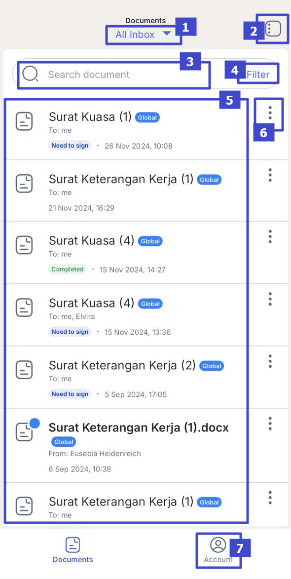 | 3 | Search bar | Klik untuk mencari dokumen berdasarkan kata kunci tertentu. |
