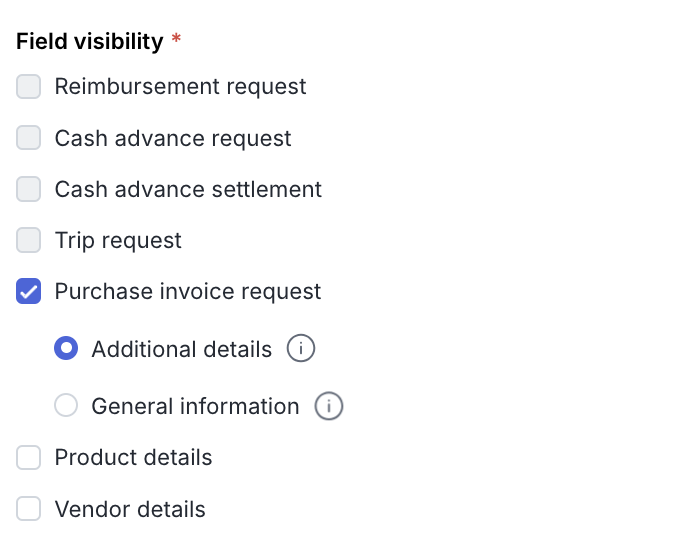 Lalu pada bagian Field visibility, centang toggle Purchase invoice request. Kemudian akan muncul pilihan sebagai berikut. Dalam hal ini, Anda dapat memilih satu dari dua opsi untuk menentukan field yang akan muncul pada halaman Create purchase invoice.