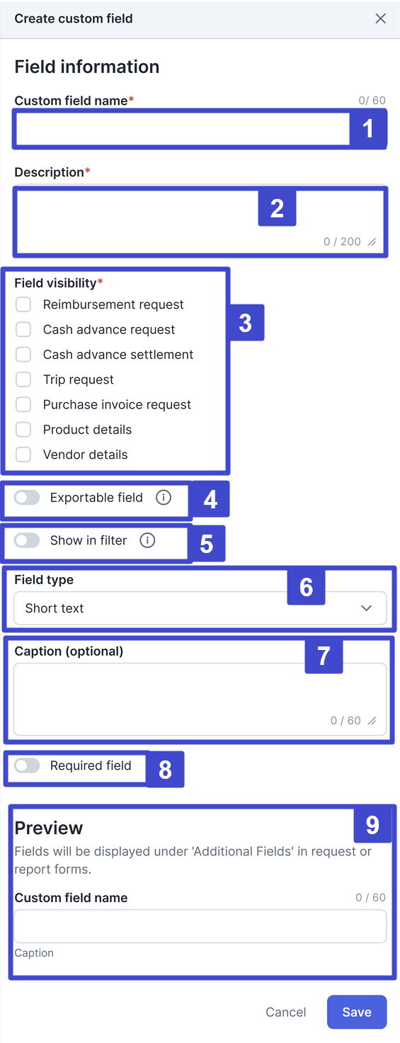 Keterangan:No. Nama Fitur Penjelasan 1 Custom field name Nama custom field. 2 Description Deskripsi dari custom field yang dibuat. 3 Field visibility Penerapan custom field pada transaksi pengajuan reimbursement request, cash advance request, cash advance settlement, trip request, purchase invoice request, product details, dan vendor details. 4 Exported field Geser toggle ini jika field dapat di-ekspor dalam format .csv.