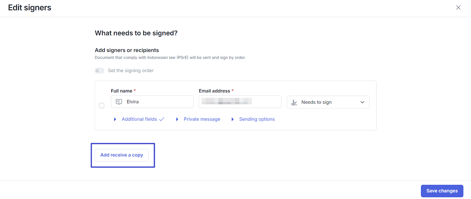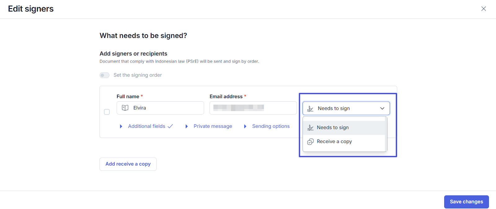 Jika perlu, Anda juga dapat mengubah role email tersebut apakah sebagai penandatangan (Need to sign) atau sebagai penerima salinan dokumen (Receive a copy).