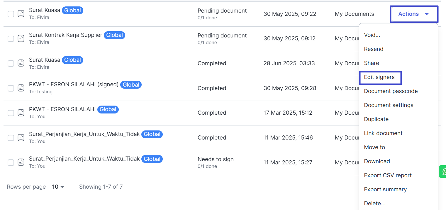 Pilih dokumen yang ingin diubah emailnya, lalu klik “Actions” dan pilih Edit signers.