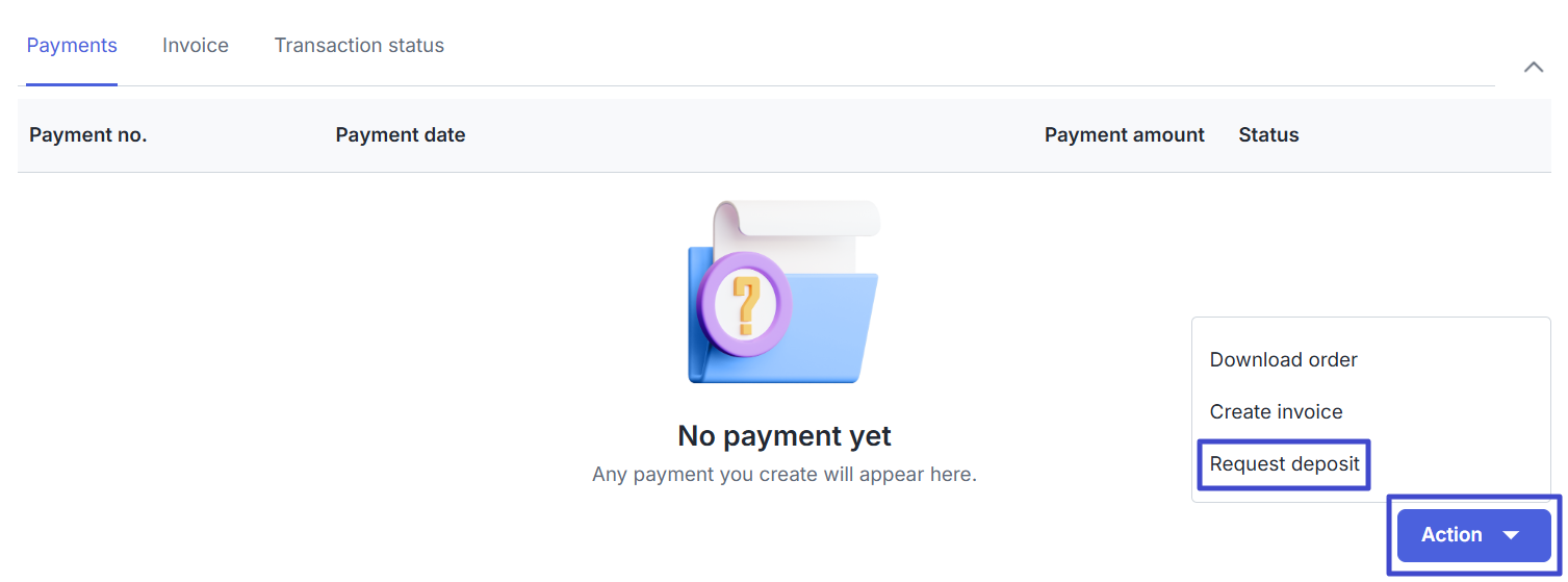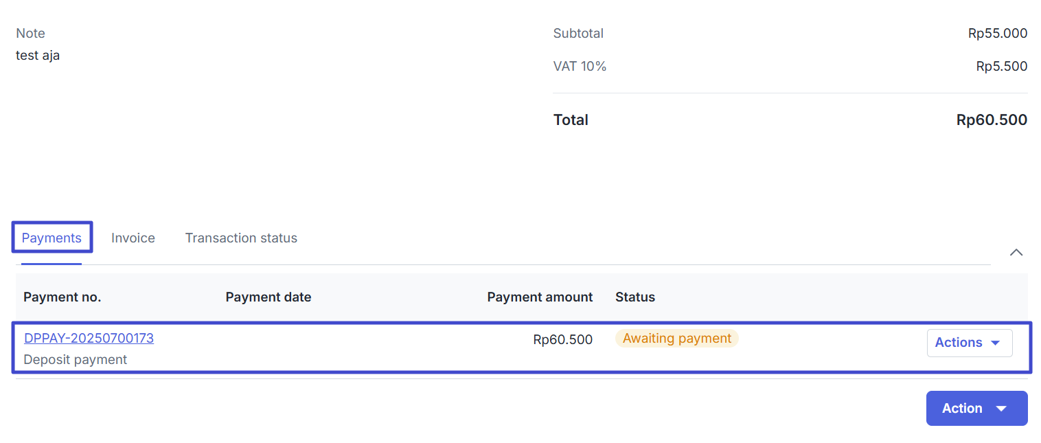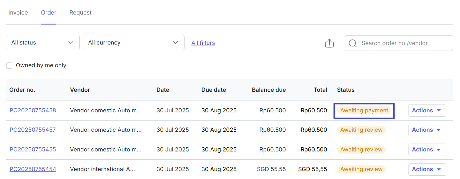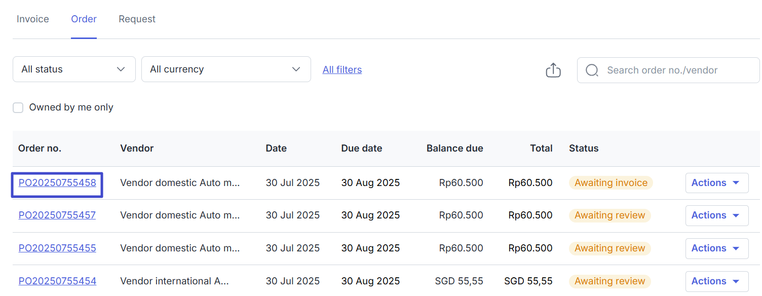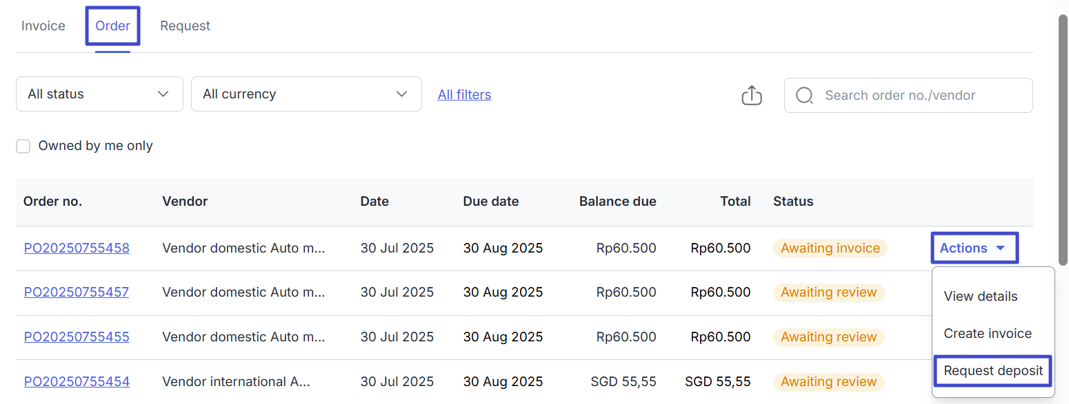 Anda akan otomatis masuk ke submenu Purchases. Kemudian, pada tab Order pilih salah satu nomor order dengan status Awaiting invoice dan klik “Actions” lalu pilih Request deposit.