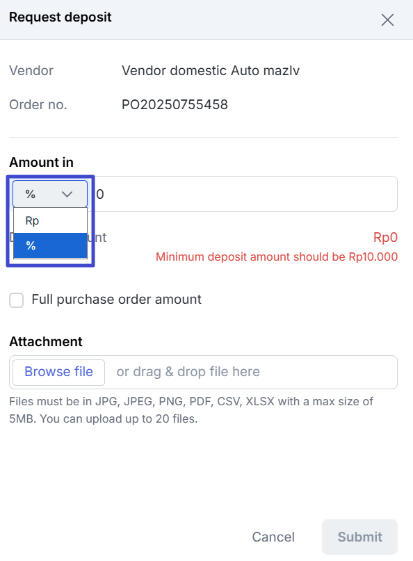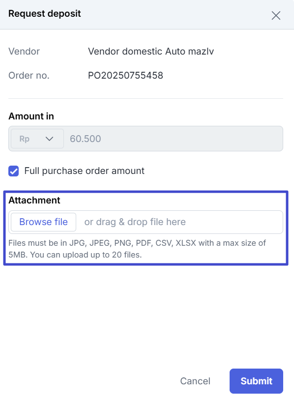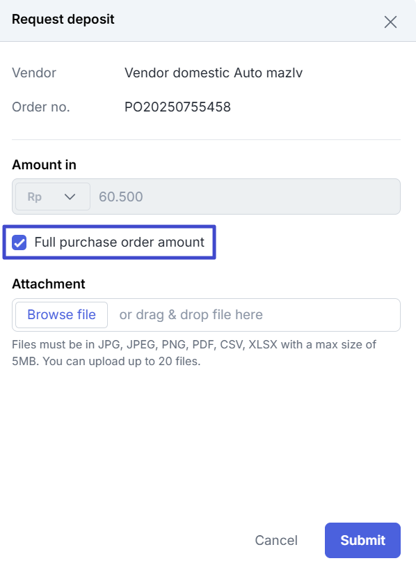 Anda juga dapat mencentang Full purchase order amount, jika ingin request deposit full sesuai nominal purchase order.