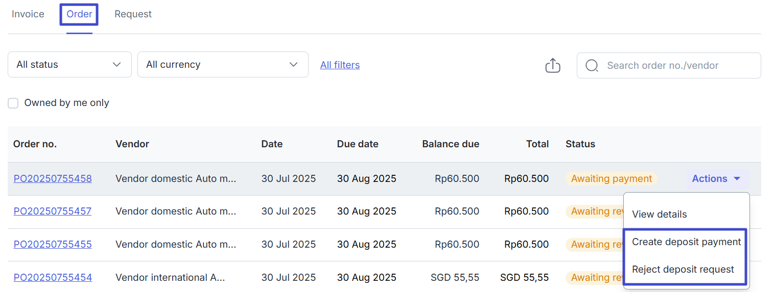 Kemudian, pada tab Order pilih salah satu nomor order dengan status Awaiting payment dan klik “Actions” lalu pilih Create deposit payment untuk membuat pembayaran atas request deposit tersebut atau pilih Reject deposit request jika ingin menolak request tersebut.