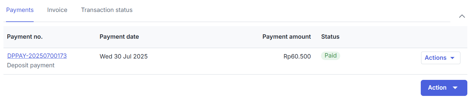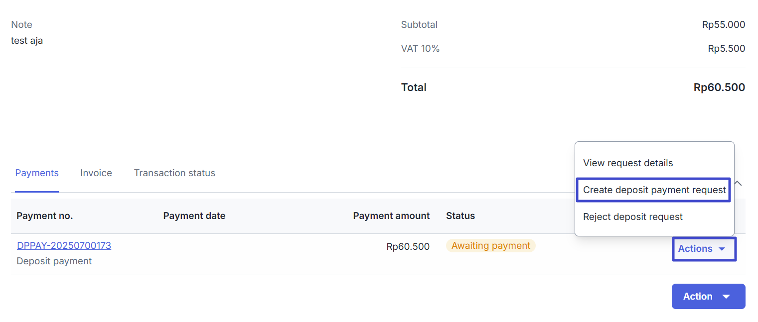 Scroll ke bagian bawah klik tombol “Actions” dan pilih Create deposit payment request.