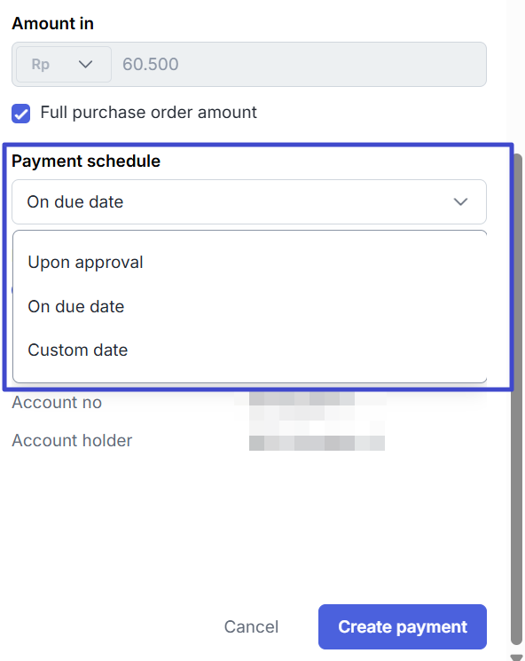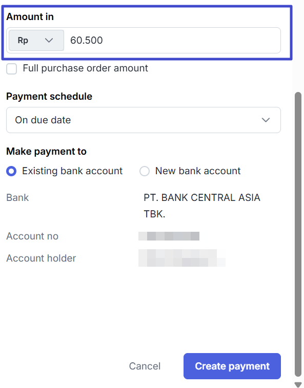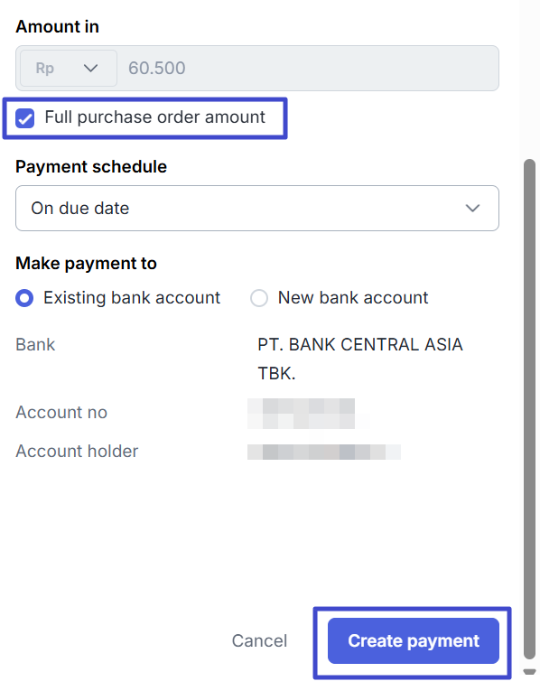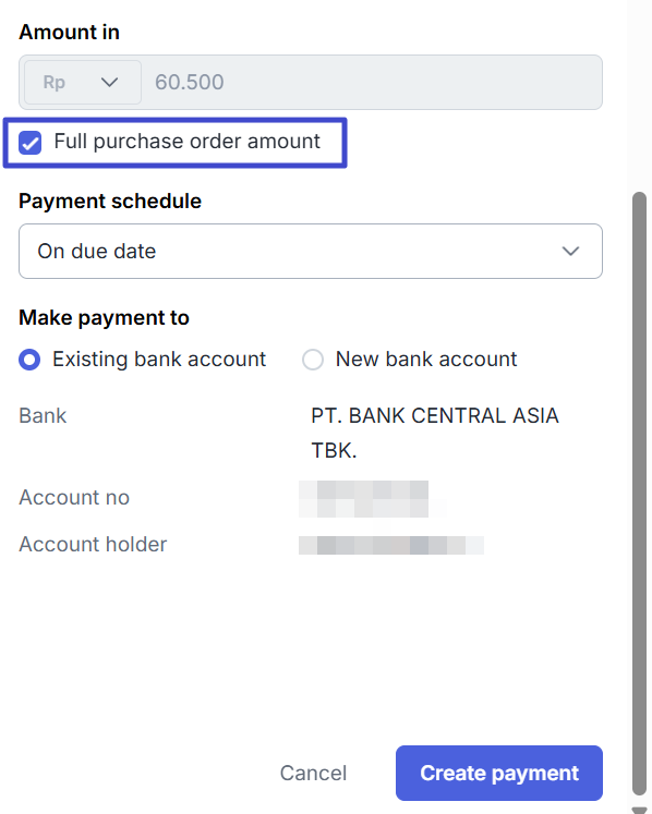 Atau centang Full purchase order amount untuk melakukan pembayaran full sesuai nominal yang tertera pada purchase order.