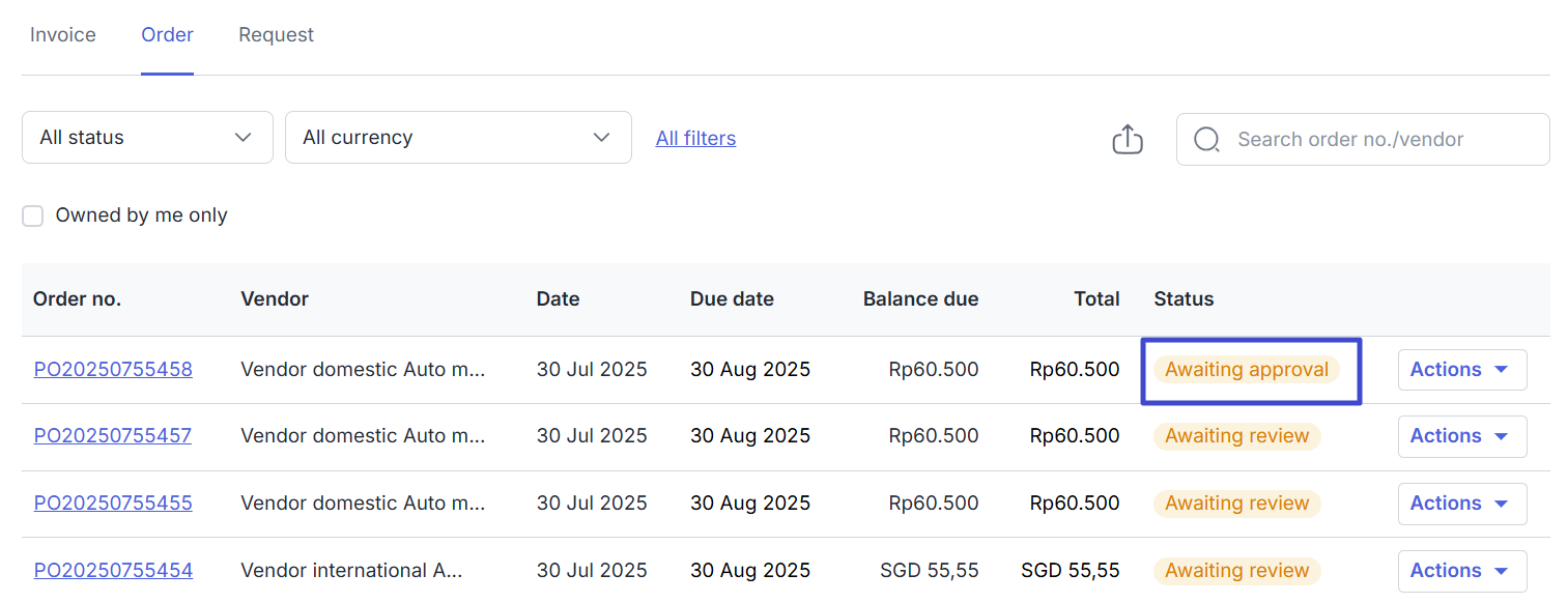 Selanjutnya, purchase order akan berstatus Awaiting approval.