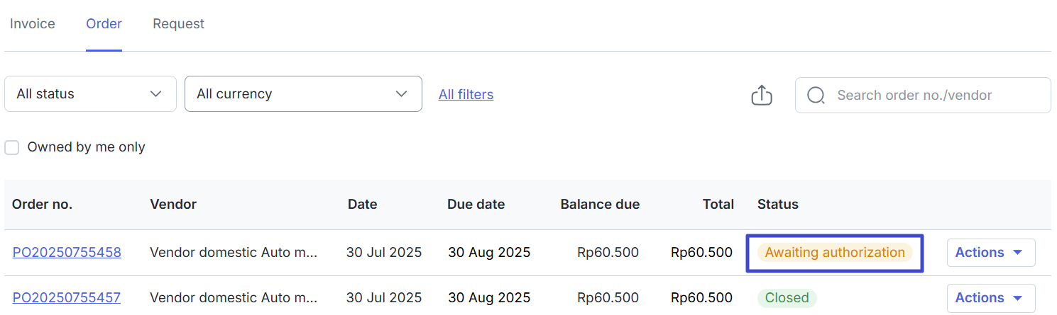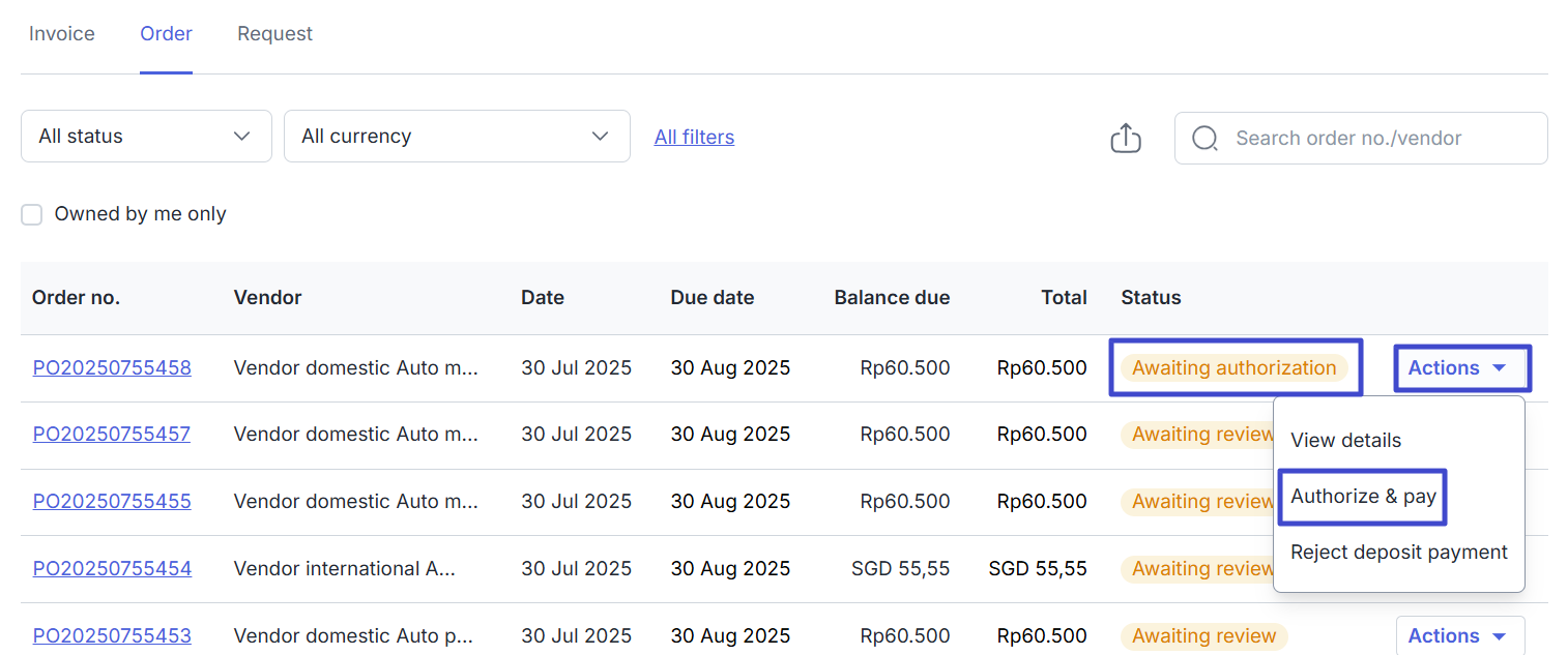 Setelah dilakukan approval, status akan berubah menjadi Awaiting authorization dan Anda dapat klik tombol “Actions” dan pilih Authorize & pay untuk melakukan pembayaran.