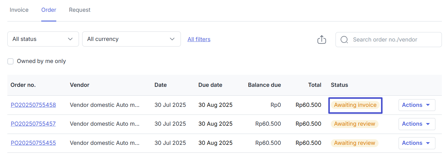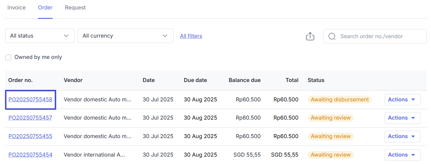 Setelah request deposit sudah dilakukan, maka status pembayaran purchase order akan berubah menjadi Awaiting Payment, yang artinya tim Finance harus melakukan pembayaran atau pembatalan atas request tersebut. Berikut langkah-langkahnya.