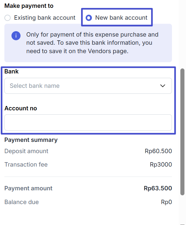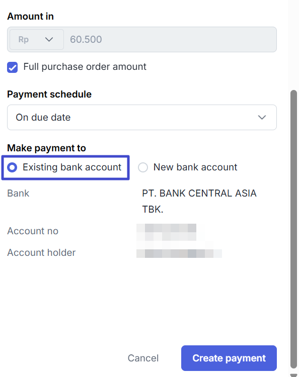 - Custom date: Pembayaran dilakukan pada tanggal tertentu. Pilih Existing bank account jika ingin pembayaran dilakukan pada nomor rekening yang sudah didaftarkan sebelumnya.