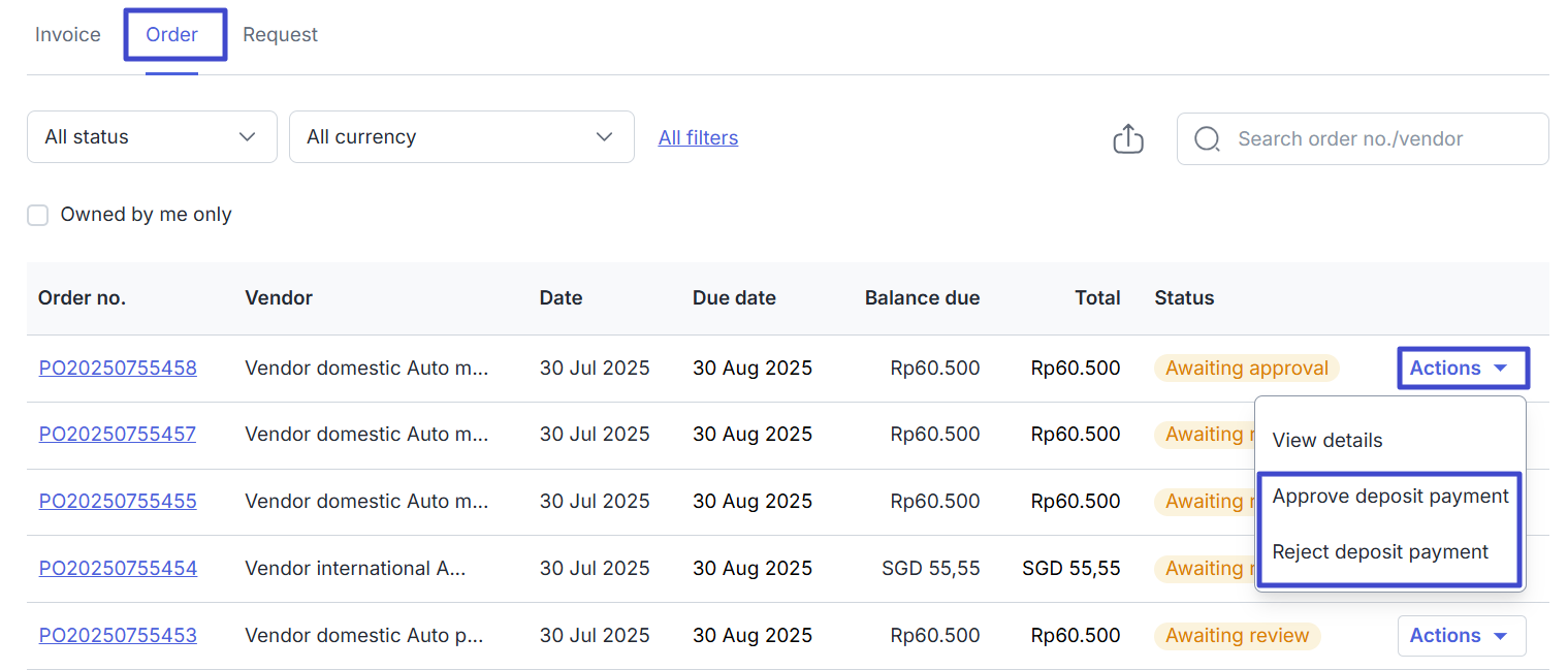 Kemudian, pada tab Order pilih salah satu nomor order dengan status Awaiting approval dan klik “Actions” lalu pilih Approve deposit payment untuk menyetujui pembayaran atas request deposit tersebut atau pilih Reject deposit payment jika ingin menolak request tersebut.
