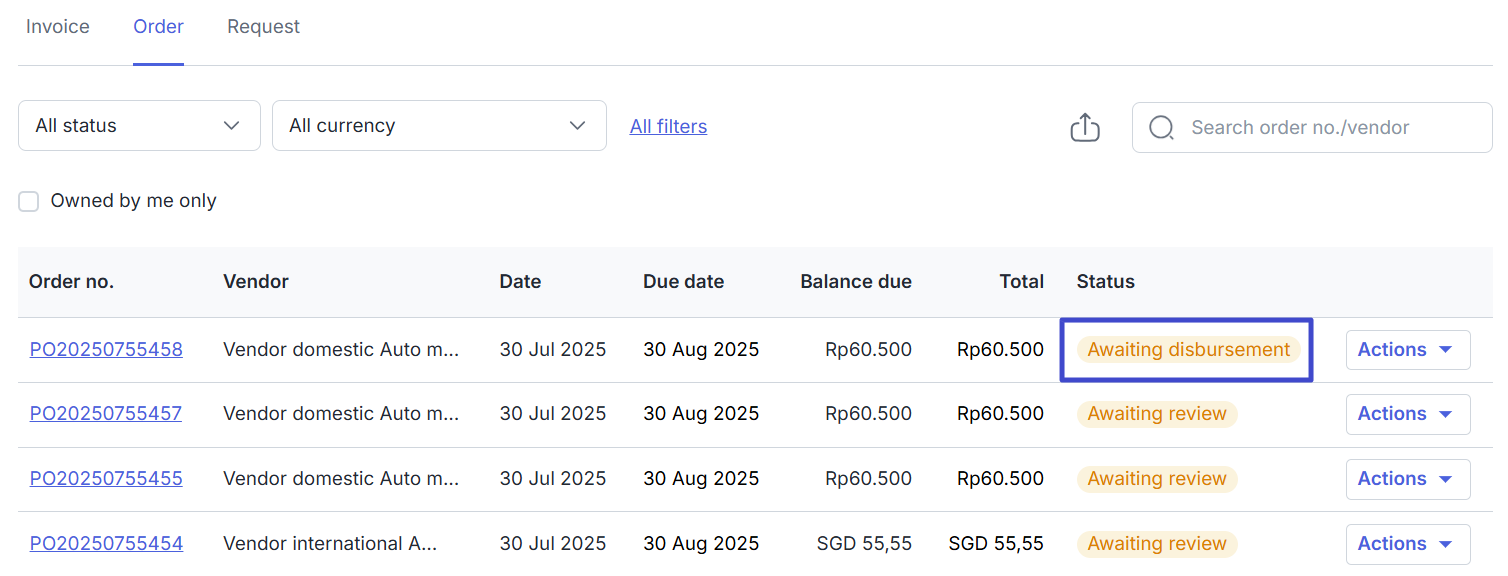 Maka status purchase order akan berubah menjadi Awaiting disbursement.