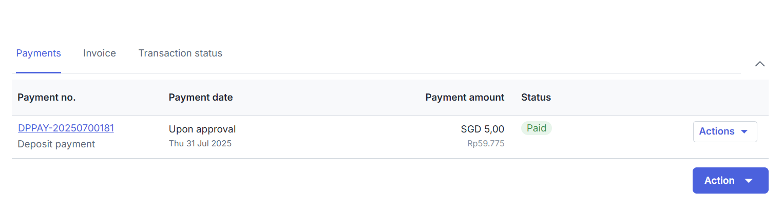 Jika disbursement sudah selesai, maka status akan berubah menjadi Awaiting invoice. Dan Anda dapat melanjutkan ke tahapan pembuatan invoice atau kembali melakukan request deposit jika masih terdapat sisa pembayaran.