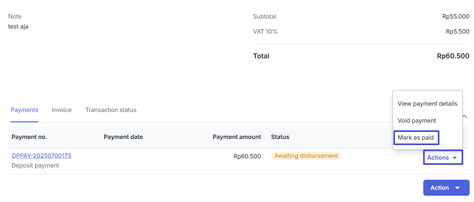 Pada bagian bawah klik tombol “Actions” dan pilih Mark as paid.