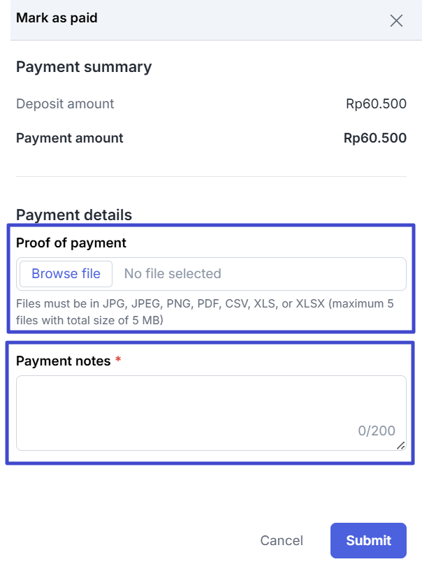 Pada pop up yang muncul, Anda dapat memasukkan bukti pembayaran (opsional) dan masukkan juga catatan mengenai pembayaran tersebut pada kolom yang disediakan.
