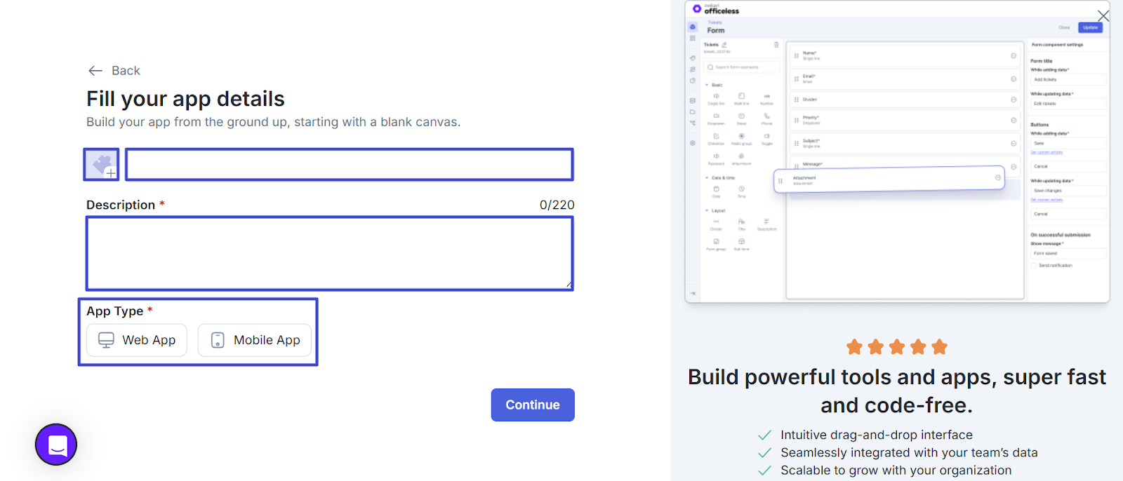 Isi informasi atau detail aplikasi yang akan dibuat, seperti ikon, nama aplikasi, deskripsi yang menggambarkan aplikasi, dan pilihan tipe aplikasi (aplikasi support web dan/atau mobile).