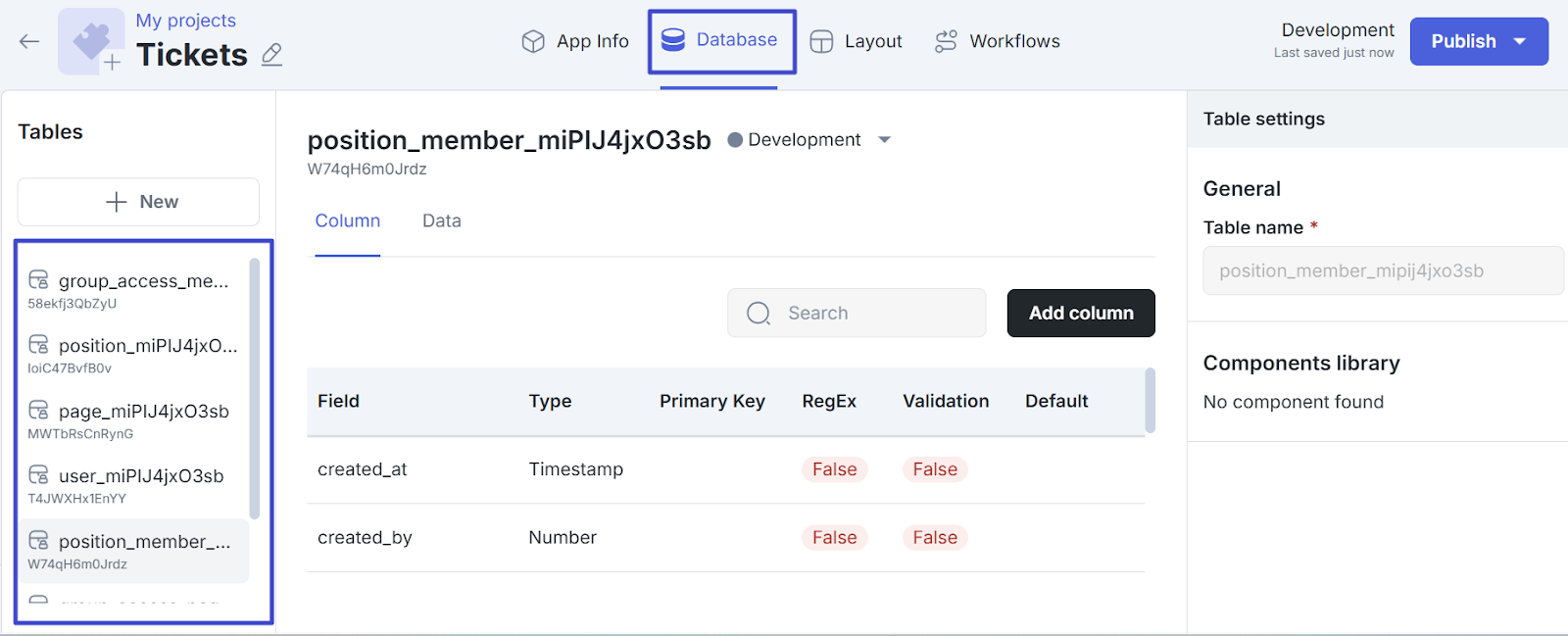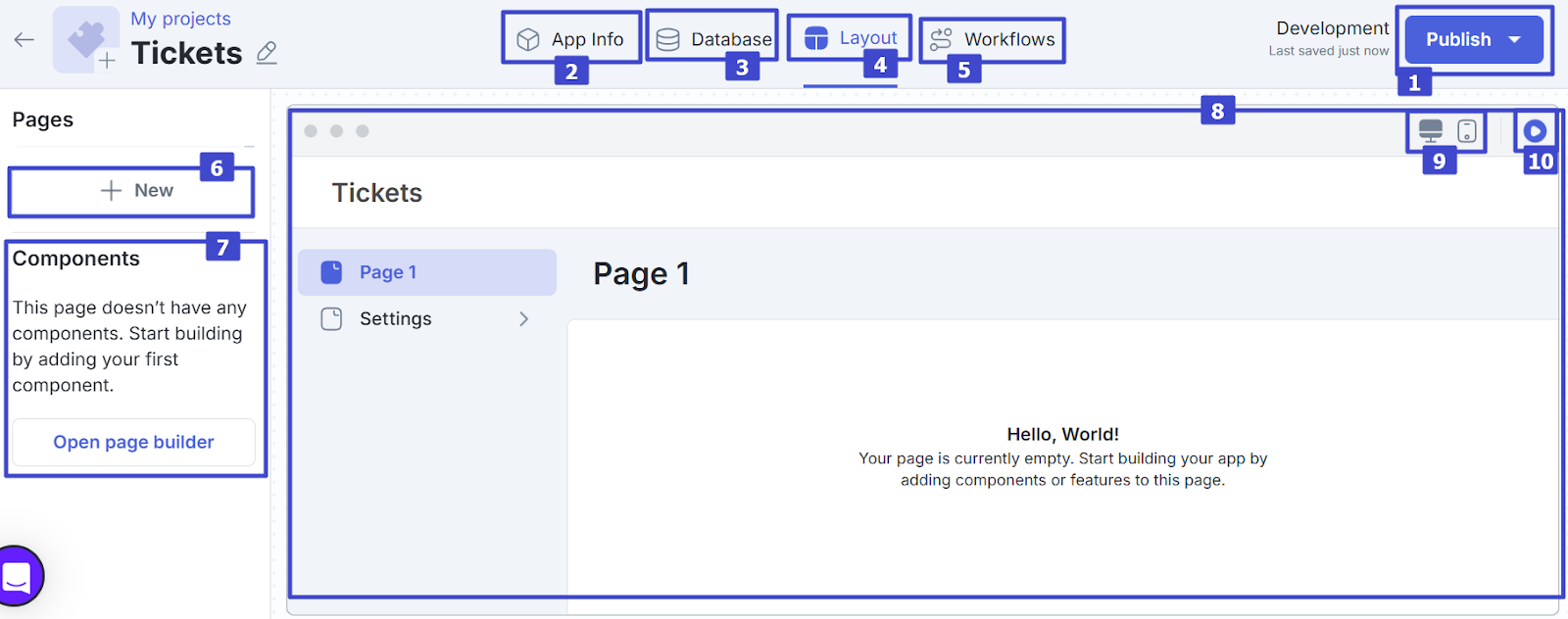 Keterangan:No Kolom Penjelasan 1 Publish Tombol untuk mempublish project. 2 App info Tab untuk melihat informasi project. 3 Database Tab untuk menambahkan database pada project. 4 Layout Tab untuk melihat dan menambahkan komponen pada tampilan project. 5 Workflows Tombol untuk menyusun skema logika automasi ataupun integrasi antar berbagai sistem. 6 Pages +New Tombol untuk untuk mengatur halaman aplikasi. Setiap halaman dapat berisi elemen-elemen berbeda sesuai dengan tujuan aplikasi dibuat. 7 Components (Open page builder) Tombol untuk menambahkan komponen pada project. 8 Projects Layout Menampilkan layout dari project yang sedang dibuat. 9 Desktop/Mobile Tombol untuk melihat tampilan desktop/mobile. 10 Preview Tombol untuk menampilkan pratinjau project sebelum disimpan, dikirim, atau dipublikasikan. -