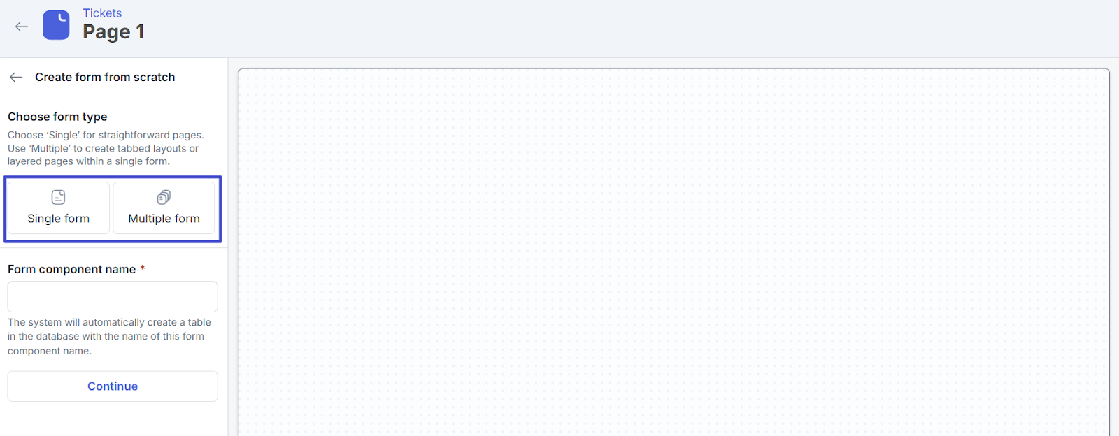 Selanjutnya, Anda dapat memilih tipe form. Pilih Single form untuk halaman sederhana yang hanya membutuhkan satu table sebagai sumber data. Pilih Multiple form untuk kebutuhan menampilkan data dengan lebih dari satu table sebagai sumber data, data akan ditampilkan dengan tab atau halaman berlapis di dalam satu form.