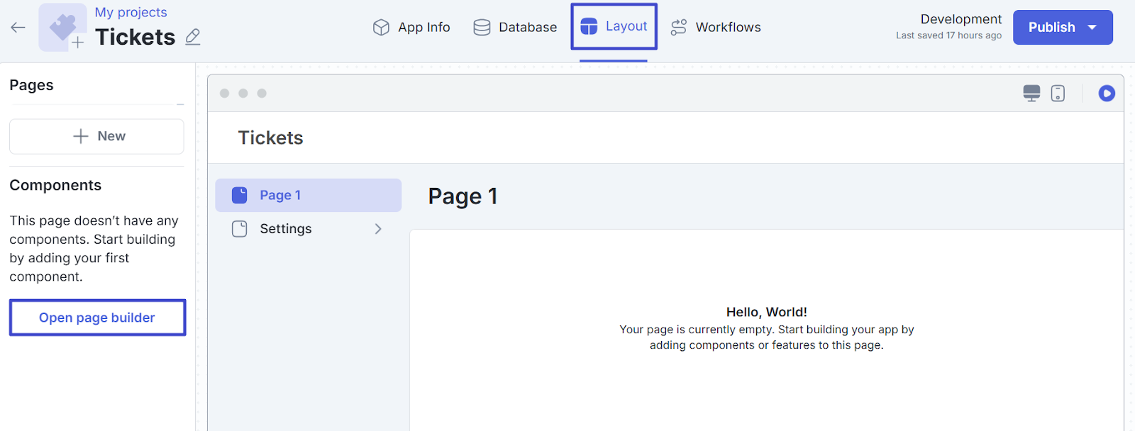 Untuk membuat form baru, klik tombol “Open page builder” pada bagian Components yang ada di sebelah kiri.