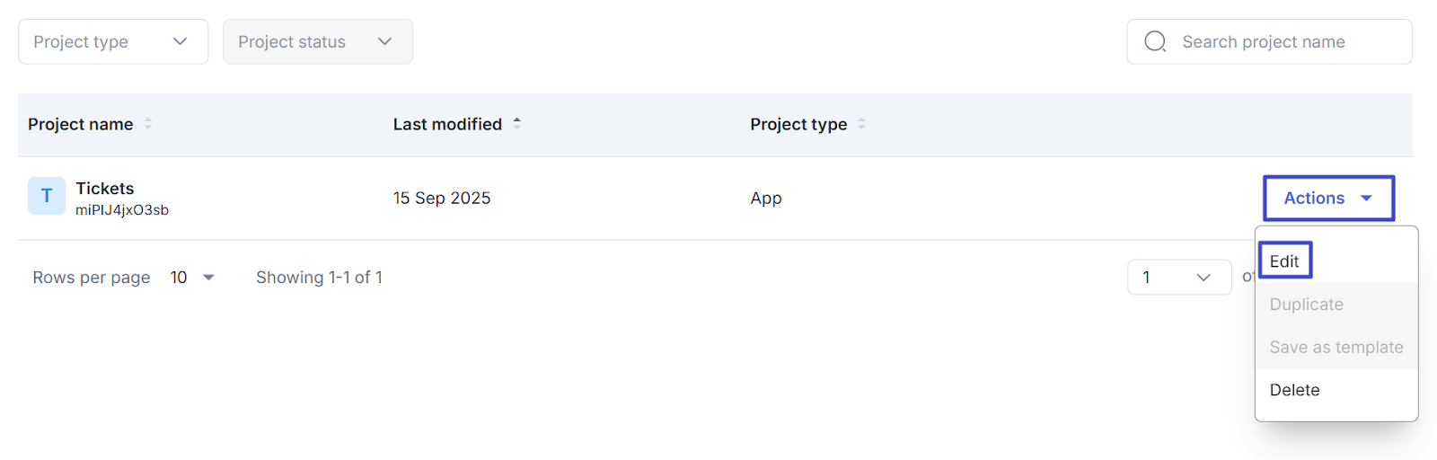 Pilih salah satu project tipe aplikasi yang sudah dibuat sebelumnya, klik tombol “Actions” dan pilih Edit.