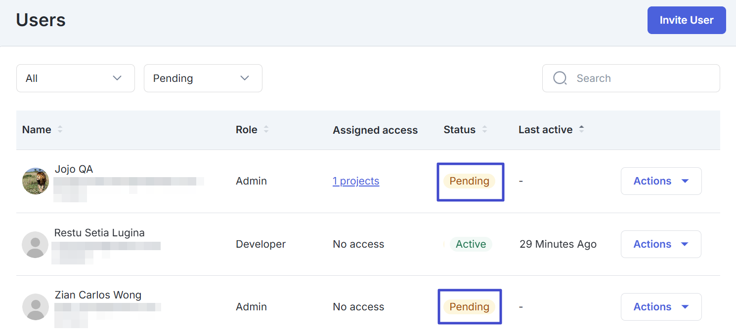 Pengguna yang diundang namun belum menerima Undangan akan berstatus Pending.