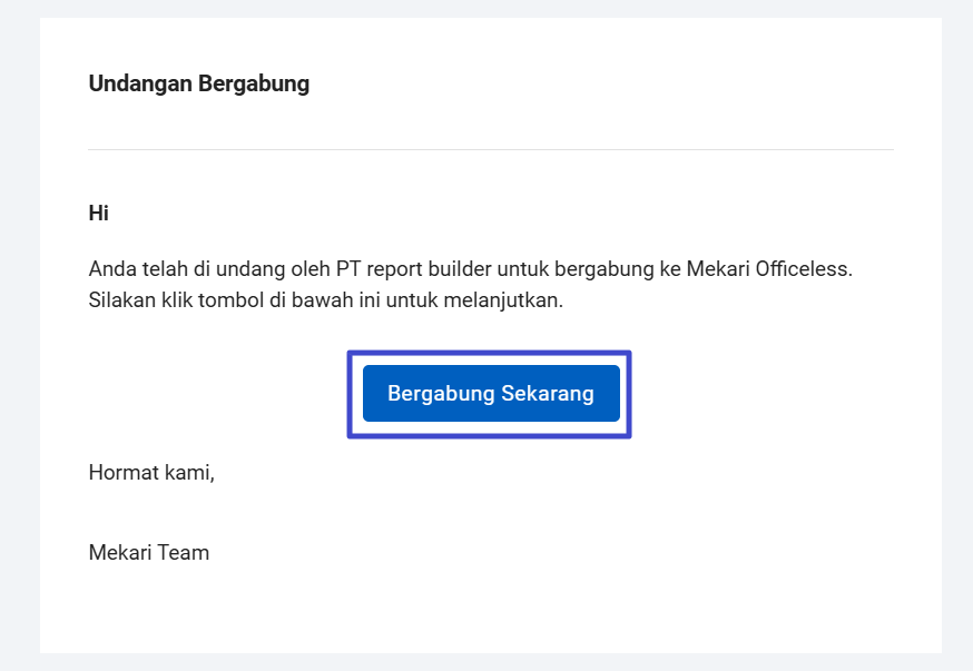 Selanjutnya, pengguna akan menerima email undangan dengan judul email “Undangan untuk bergabung ke Mekari Officeless” dan harus mengklik tautan Bergabung Sekarang untuk membuat atau mengakses akun.