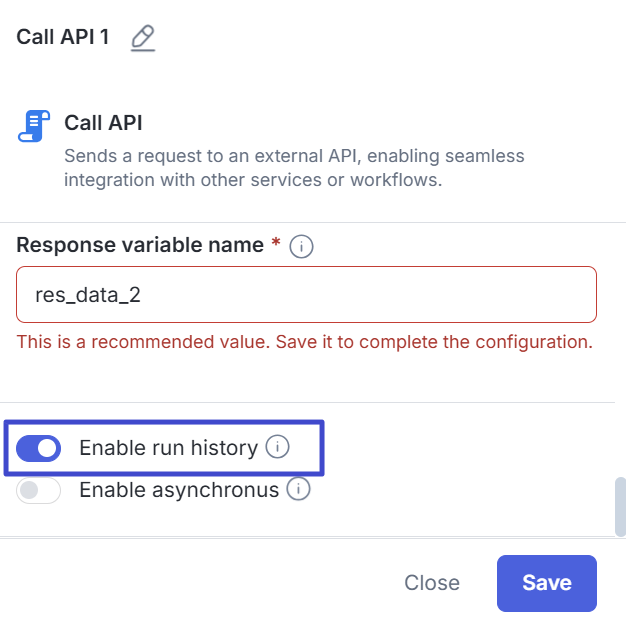 Geser toggle Enable run history untuk mencatat riwayat setiap kali API dipanggil.