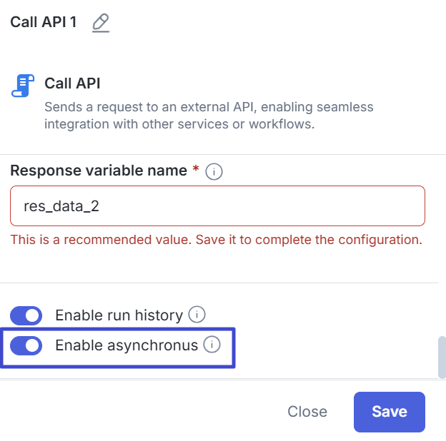 Jika toggle Enable asynchronous diaktifkan, workflow tidak akan menunggu hasil respons API untuk melanjutkan ke langkah berikutnya.
