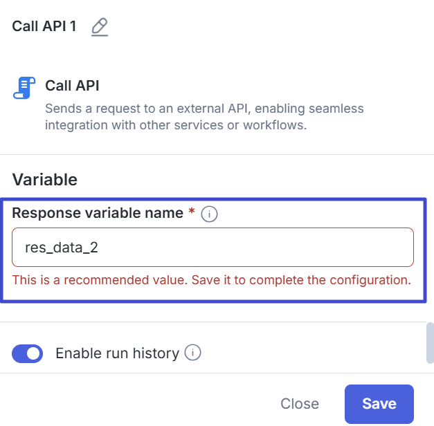 Tentukan nama variabel untuk menyimpan data balikan (respons) dari API pada bagian Response variable name. Variabel ini bisa digunakan di langkah berikutnya di workflow.