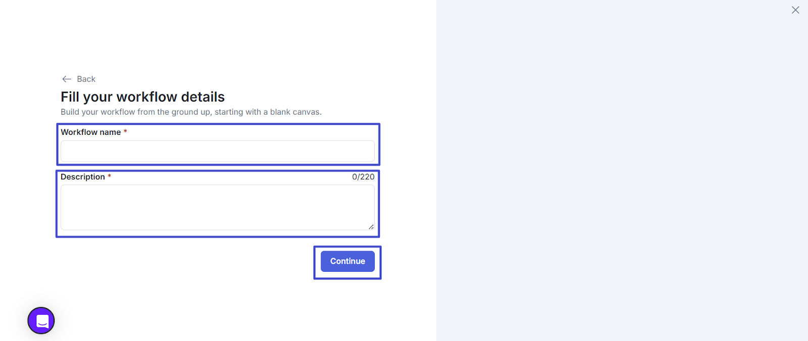 - Masukkan nama dan deskripsi workflow yang Anda inginkan lalu klik “Continue” untuk melanjutkan.