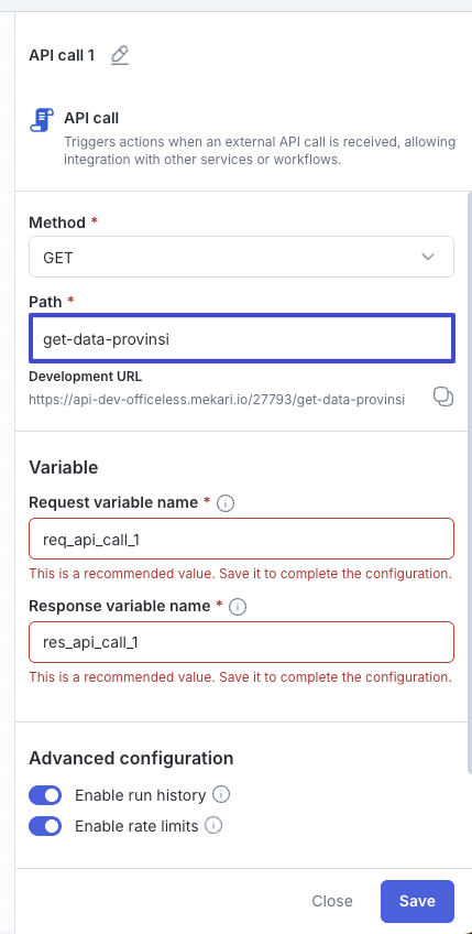 Pada fitur workflow, Anda dapat membuat API endpoint yang berguna untuk menjalankan sistem ketika API tersebut dipanggil. Berikut langkah-langkahnya.