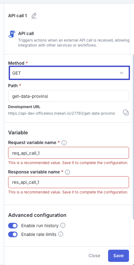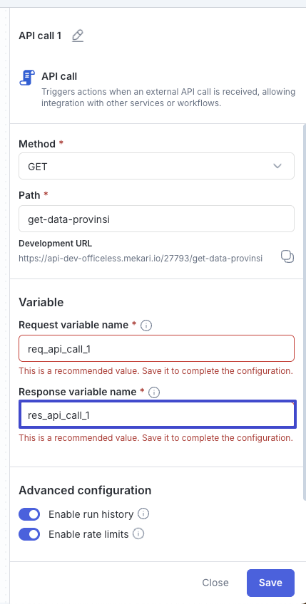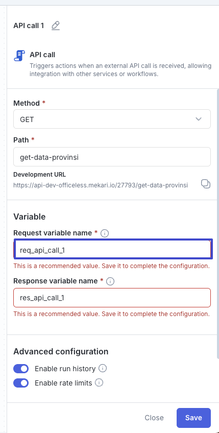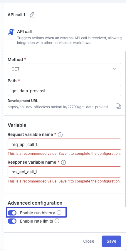 - Geser toggle Enable run history jika ingin mengaktifkan atau mematikan pencatatan riwayat setiap kali API dipanggil.