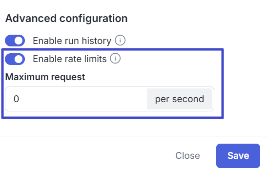 - Anda juga dapat geser toggle Enable rate limits jika ingin menambahkan pengaturan untuk membatasi jumlah permintaan (request) ke Workflow API dalam jangka waktu tertentu (misalnya Maximum request 0 per detik).