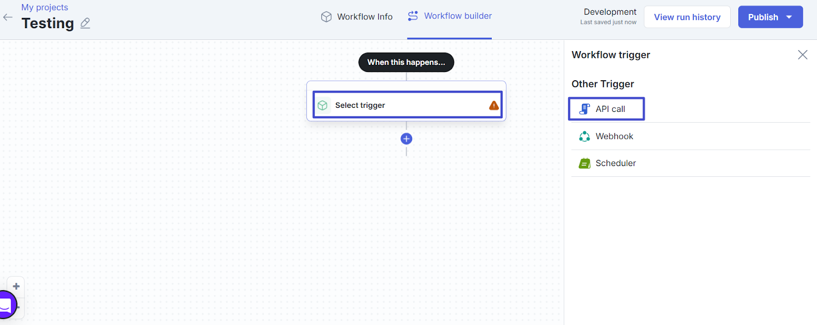 - Klik “Select trigger” dan pilih API Call.
