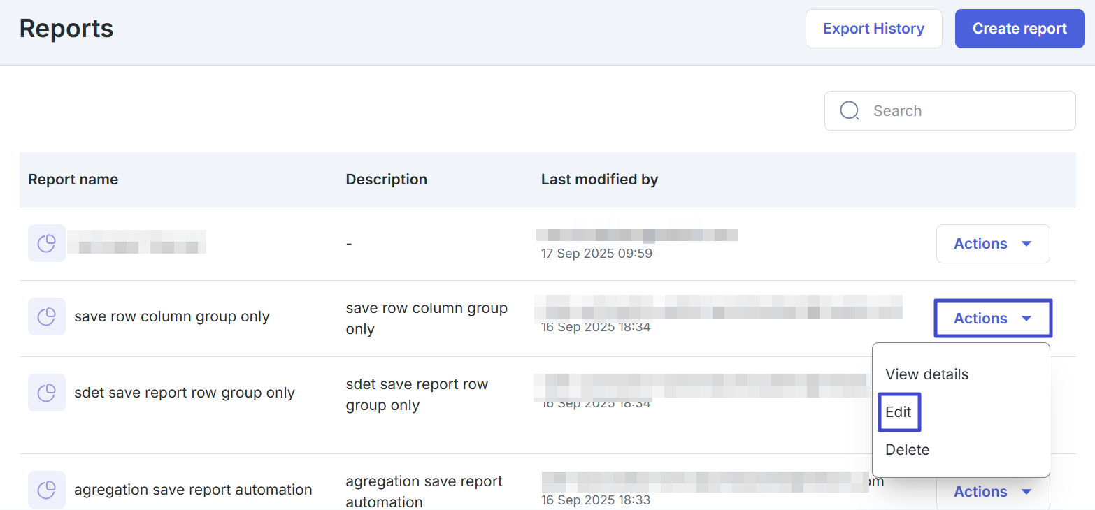 Pilih report yang ingin dikelompokkan dengan klik “Actions” lalu pilih Edit.