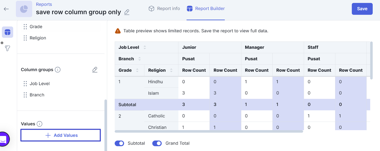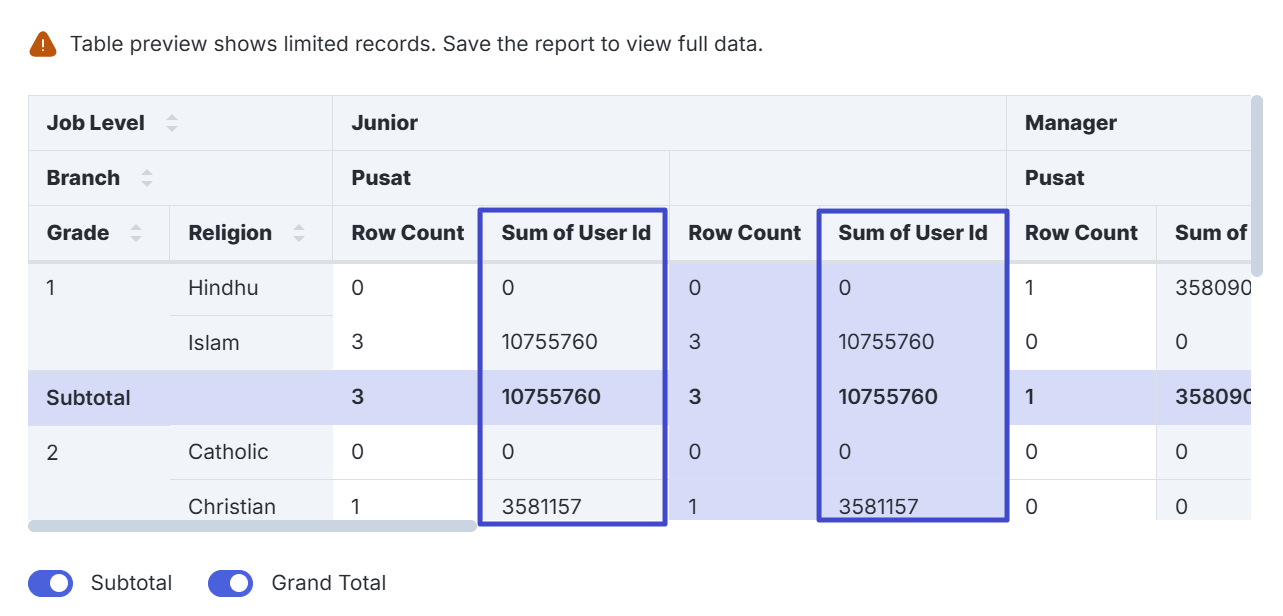 Pada Report di Mekari Officeless, Anda dapat menambahkan perhitungan agregasi seperti total, rata-rata, jumlah baris, maksimum, minimum terhadap suatu kolom.