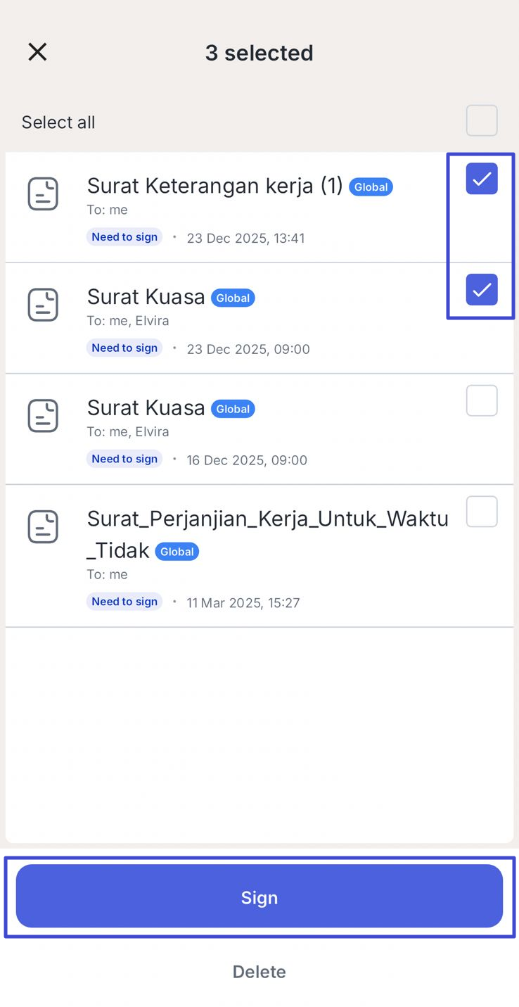 Lalu akan muncul checkbox seperti berikut, centang dokumen-dokumen yang ingin Anda tandatangani sekaligus dan klik “Sign”.