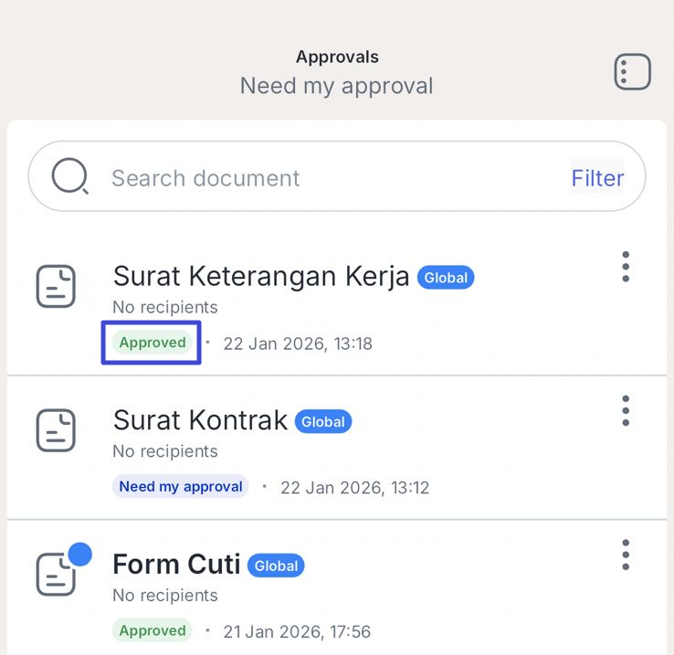 Demikian penjelasan mengenai cara melakukan approval melalui Mekari Sign Mobile.