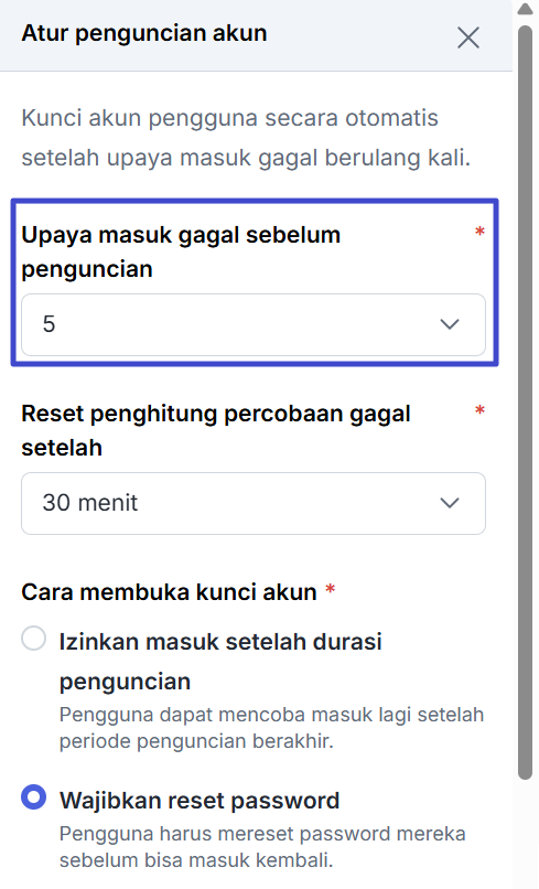 Akan muncul pop-up berikut, pada bagian Upaya masuk gagal sebelum penguncian pilih setelah berapa kali percobaan akun akan dikunci.