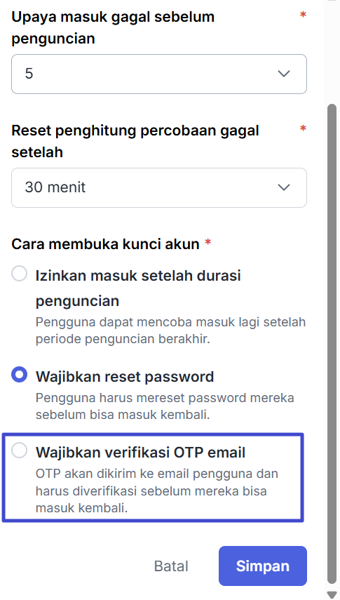 Terakhir terdapat Wajib verifikasi OTP email, di mana pengguna perlu melakukan verifikasi OTP melalui email untuk dapat masuk ke dalam akun.